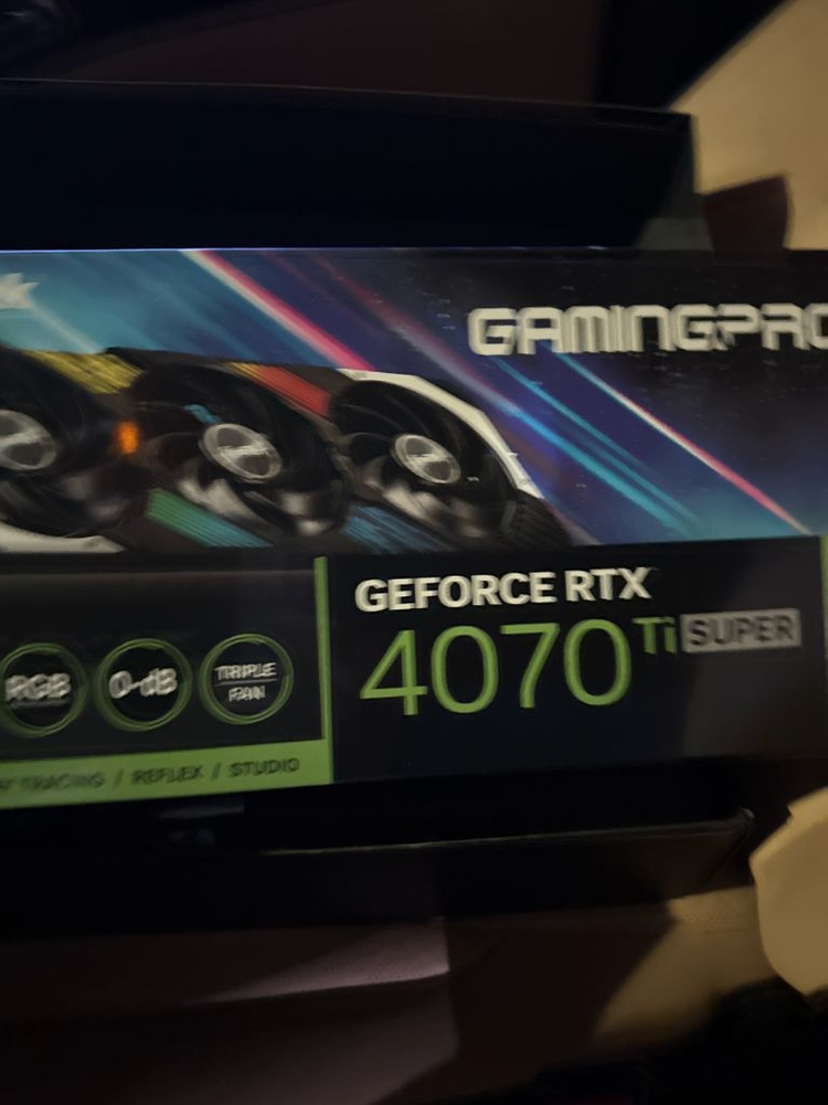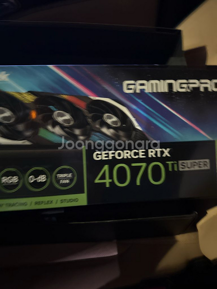 GeForce RTX 4070 Ti SUPER 그래픽카드입니다. 박스와 구성품이 모두 포함되어 있고 상태 양호해요. 게이밍용으로 최적화된 고성능 GPU입니다. 풀박스 구성품 다있어요 체굴 ,흡연 , 애완 절대 없고 서든만 돌렸습니다