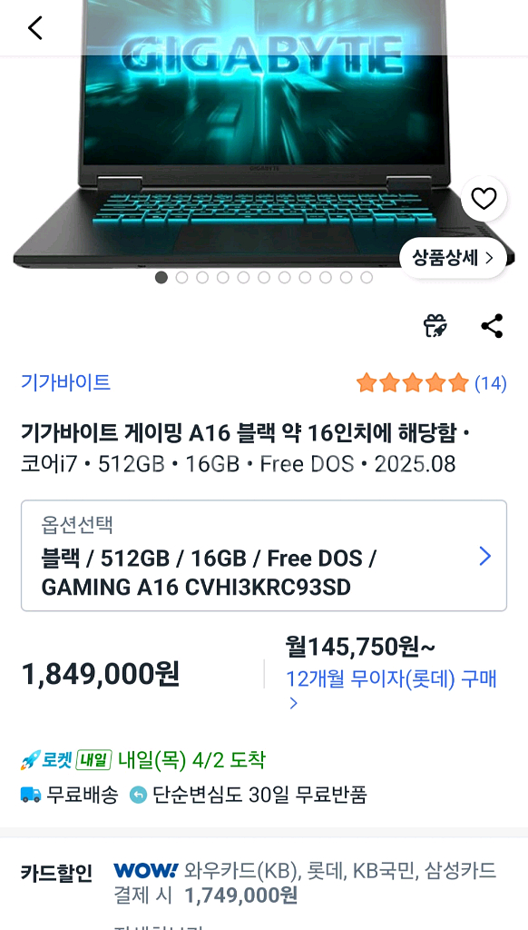 2026 3월16일 구매 제품보증: 기가바이트 서비스센터 2년 무상보증 모델명: GIMAING A16 CVHI3KRC93SD 운영체제: FreeDos (윈도우 미탑재) 프로세서 (CPU): Intel® Core™ i7-13620H 24M 캐시, 최대 4.9 GHz 10 코어 / 16 스레드 메모리 (RAM): DDR5 16GB x1 메모리 슬롯: DDR5 So-Dimm 슬롯 2개 (최대 64GB 확장 가능) 디스플레이: 16인치 16:10 IPS WQXGA (2560x1600) 165Hz 초슬림 베젤, 400 nit 밝기, sRGB 100%, 3ms 반응속도 그래픽 (GPU): NVIDIA GeForce RTX 5060 8GB GDDR7 저장장치 (SSD): NVMe Gen4 512GB 저장 슬롯: NVMe Gen4 x2 (최대 4TB 확장 가능) 부가 기능 및 연결성 오디오: 2 x 2W 스피커 (Dolby Atmos 지원) 무선 및 블루투스: * Wi-Fi: Intel® Wi-Fi 6E LAN: 1G Bluetooth: V5.2 카메라: HD (1080p) IR 웹캠, 빌트인 어레이 마이크 키보드: 백라이트 키보드, 골드커브 키캡 입출력 포트 (I/O Ports) 좌측면: 1 x Type-C USB 3.2 Gen1 (DP 1.4, PD 3.0 지원) 1 x Type-A USB 3.2 Gen1 1 x HDMI 2.1 1 x 유선랜 (RJ-45) 1 x 전원 포트 우측면: 1 x Type-A USB 3.2 Gen1 1 x Type-A USB 2.0 1 x 3.5mm 오디오 잭 (헤드폰/마이크 콤보) 규격 및 보증 배터리: 리튬폴리머 76Wh 크기: 35.83 x 26.25 x 1.95~2.3 (cm) 무게: 2.2kg