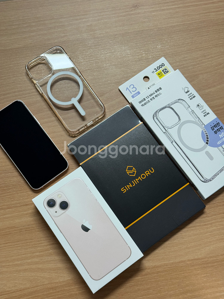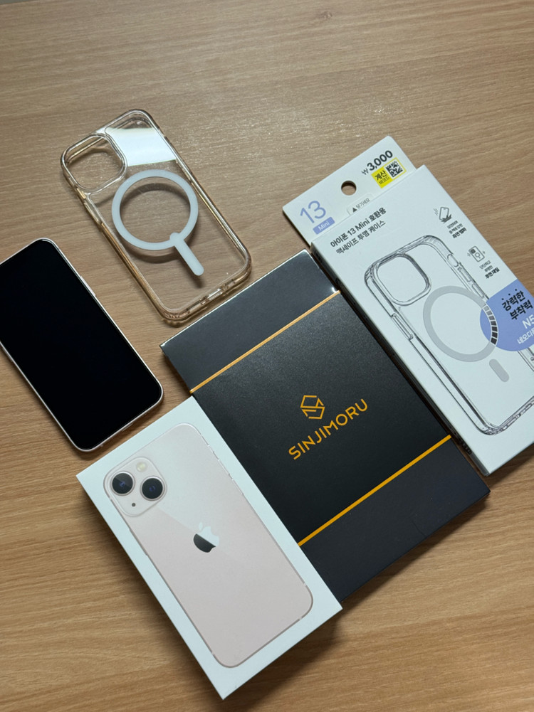 아내가 사용하던 아이폰13미니 판매합니다~ 항시 케이스 사용하였으며 사진과 같이 외부 스크래치 및 찍힘 없습니다. 충전케이블 미사용입니다. 다이소 맥세이프 케이스 사용하던 제품 1개, 새제품 1개, 신지모루 강화유리 2매 새상품 함께 드립니다. 약 2년 전에 한번 새상품으로 전체 리퍼받은 제품이라 13미니 중에 하드웨어 상태는 좋은 쪽에 속할거라고 생각합니다.