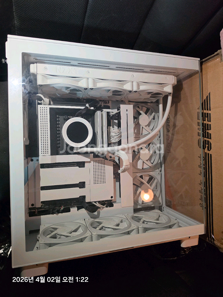 7950x3d 반본체 판매 합니다(그래픽카드는 없음) CPU - 7950X3D(라파엘)멀티팩 정품 메인보드 - NZXT N7 B650E Matte White 쿨러 - NZXT KRAKEM ELITE 360 RGB(WHITE) NZXT F120 RGB DUO Matte White 10개 메모리 - TeamGroup DDR5-4800 CL40 Elite 서린(32G*2=64G) 메모리방열판 - LEADCOOL RH-1 EVO ARGB 메모리 방열판 화이트 SSD - SK하이닉스 Platinum P41 M.2 NVMe 1TB HDD - Western Digital WD BLUE(8TB) 케이스 - NZXT H9 Flow(Matte White) 파워 - SuperFlower SF-1000F19PE9 LEADEX VI PRO PLATINUM WHITE(PCIE 5) 박스 다 있습니다 안산에서 직거래로만 거래 가능합니다