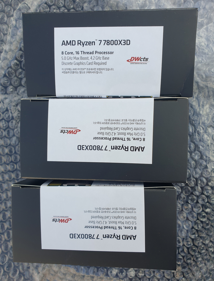 멀티팩 미개봉 정품입니다 7800X3D 38만원 5개 이상 구매시..개당 3천원씩 / 10개 이상 구매시 개당 5천원씩 네고 가능 ( 3개 이상 구매시 배송비는 무료지원 ) * 위 CPU 구매하시구..추가로 MSI B650M 박격포 wifi 미개봉품 을 구매하실 경우... 18만원, MSI B850M 박격포 WIFI 미개봉품 을 구매하실 경우 ...23만원 .... 추가금에 각각 구매 가능하구요 그외 가격 네고및 안전거래 하지않아서..답변 드리지 않구요 강북 도봉 쌍문 직거래 가능합니다 채팅으로 문의주세여