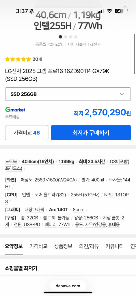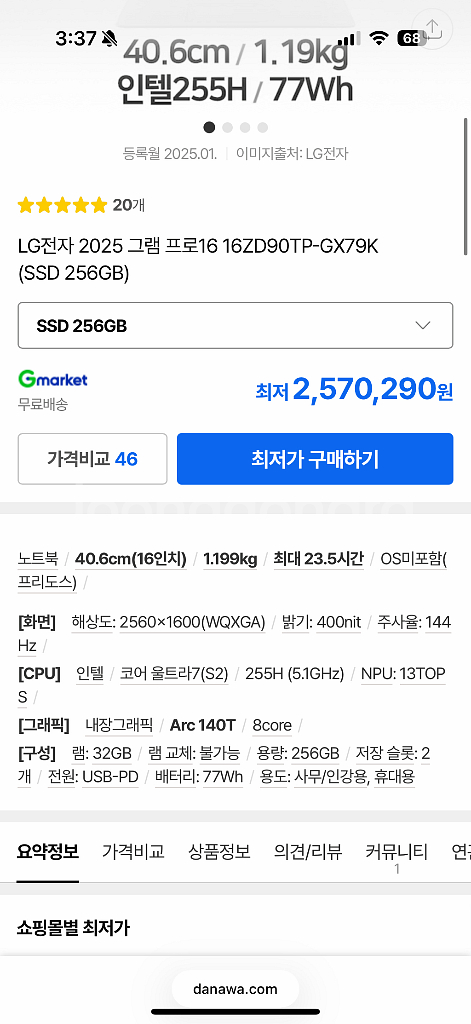 2025 LG 그램 프로 16ZD90TP-GX79K 판매합니다. CPU: Intel Ultra 7 255H RAM: 32GB SSD: 256GB GPU: Intel Arc 130T 디스플레이: 16인치 고사양 모델이고, 프로 라인답게 성능 및 배터리 효율 모두 뛰어납니다. 2025년 1월 제조 제품이며, 일반 무상 보증은 2026년 4월까지, 메인보드 등 주요 부품은 2027년 1월까지 보증입니다. 외관 상태 매우 깨끗하며, 눈에 띄는 흠집 없습니다. (사용감에 따른 미세한 흔적은 있을 수 있습니다.) 윈도우 11 Pro 정품 인증 완료,MS 오피스, 오피스 밸류팩(한글) 포함돼 있습니다. 구성품: 노트북 본체 / 충전기 / 파우치 / 박스 (풀박스) 안결됩니다 편하게 연락주세요~
