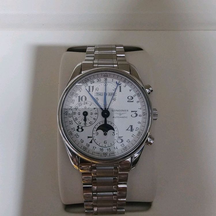 론진 마스터 컬렉션 문페이즈 크로노그래프 Ref. L2.673.4.78.6 기능 시,분,초,요일,날짜,월,문페이즈,24시간인디케이터,크로노그래프 무브먼트 셀프와인딩 L687,28,800vph,25스톤,54시간파워리저브 케이스 지름 40mm,스테인리스스틸,30m방수,글라스백 상품상태 사용감있음 구입년도 2018 09 06 한화겔러리아면세점 결제방법 직접결제 배송방법 직거래,택배거래 10개월정도 사용했습니다. 상태는 큰 스크래치는 없고 미세한 생활기스는 전체적으로 조금 있습니다. 유리에 스크래치는 없고 분실품도 하나도 없습니다. 동영상이나 더 자세한 사진이 필요하시면 보내드리겠습니다. 직거래는 2호선라인가능합니다. 직거래,안심결제로만 구매가능 반품 절대불가 주의! 기계장치의 손상을 방지하기 위해서 오후 7시에서 다음날 오전 6시 사이에는 절대 날짜와 월상을 조작, 변경하지 마십시오. 자세한 사용방법은 설명서를 참고하시거나 스와치코리아(a/s 02 3149 9555)에서 참고바랍니다. 모든설정은 오전8시에 맞춰놓고 변경해 주세요. 악어가죽줄 포함가격 입니다. 악어줄만은 따로 구매 가능하나 시계만 구매는 어렵습니다. 오버홀은 안했습니다. 길이랑 악어가죽버클(클라스프미포함)은 론진매장가셔서 교체하심 됩니다. 사용법은 설명서와 론진매장 방문하셔요~ 맨 끝사진 처럼 론진 케이스에 스크레치 한줄 있습니다. 구매시 주지 않았던 안경집,켈린더, 물병(새거), 론진 고급 융(새거)에 쇼핑백 담아 드립니다.