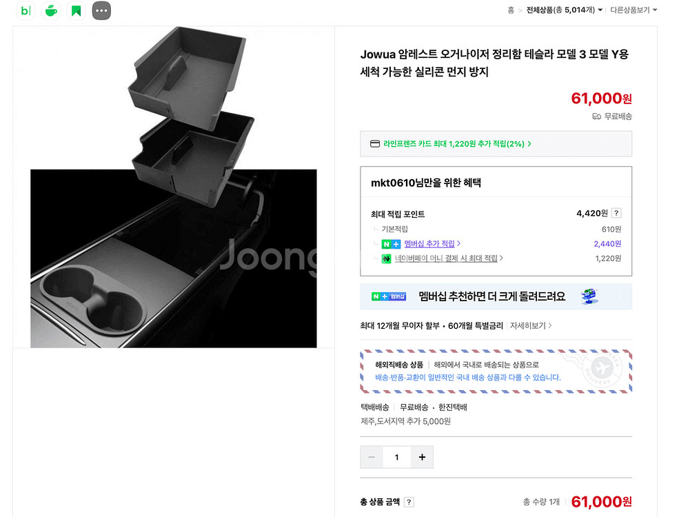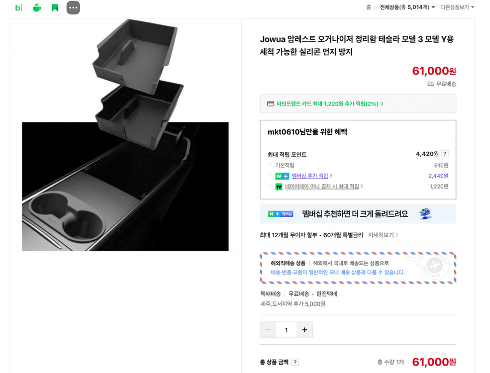 가격: 8만원 (일괄판매 / 네고 약간 가능) 거래: 강남 삼성동 직거래 ✔️ 구성 (총 4종) 센터콘솔 오거나이저 암레스트 정리함 컵홀더 인서트 차량용 폴딩 테이블 ✔️ 사용기간: 약 1년 ✔️ 상태: 전체적으로 깨끗 테슬라 실내 정리 + 활용성까지 한번에 해결되는 구성입니다. 수납, 정리, 간단한 식사/노트북 사용까지 가능해서 활용도 높아요. 신품가 기준 약 20만원 이상 구성 → 저렴하게 일괄 판매합니다. 차량 정리하면서 같이 판매합니다. 👉 개별 판매 X / 일괄만 판매 직거래 선호 (삼성동) 📩 편하게 연락 주세요