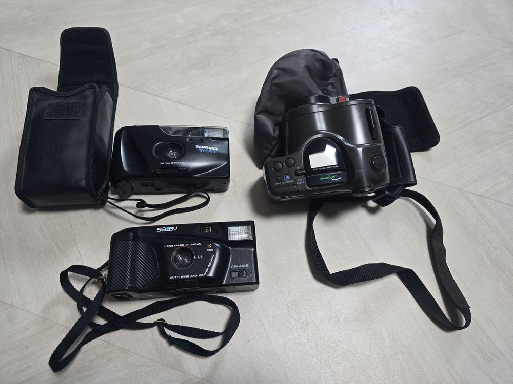 개인정보(거래정보)를 주고받는 행위는 사기에 노출될 수 있으므로 즉시 중고나라로 신고해 주세요다양한 브랜드의 컴팩트 필름카메라들이에요. 케이스와 스트랩도 함께 포함되어 있고, 전체적으로 사용감은 있지만 작동 상태는 양호해 보입니다. 필름 사진 찍기 좋아하시는 분께 추천드려요! 작동상태는 잘 모르겠어요