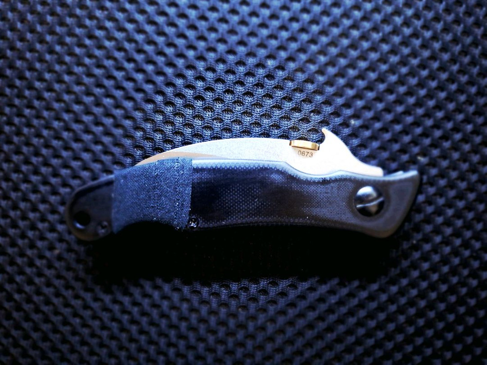 에머슨 나이프입니다. 기존 썸스터드 분해 후 황동으로 교체했습니다. 두번째 사진에서 보시다싶이 무광 아머블랙 색상으로 세라코트로 코팅되어있습니다. 웨이브피쳐 사용할때 잡기 쉽게 적층식으로 그립테이프를 붙여두었습니다. 기존의 거친 g10대신에 부드럽게 마감된 g10으로 교체했습니다. 가격에서처럼 진품은 아닙니다. 중고특성상 반품X