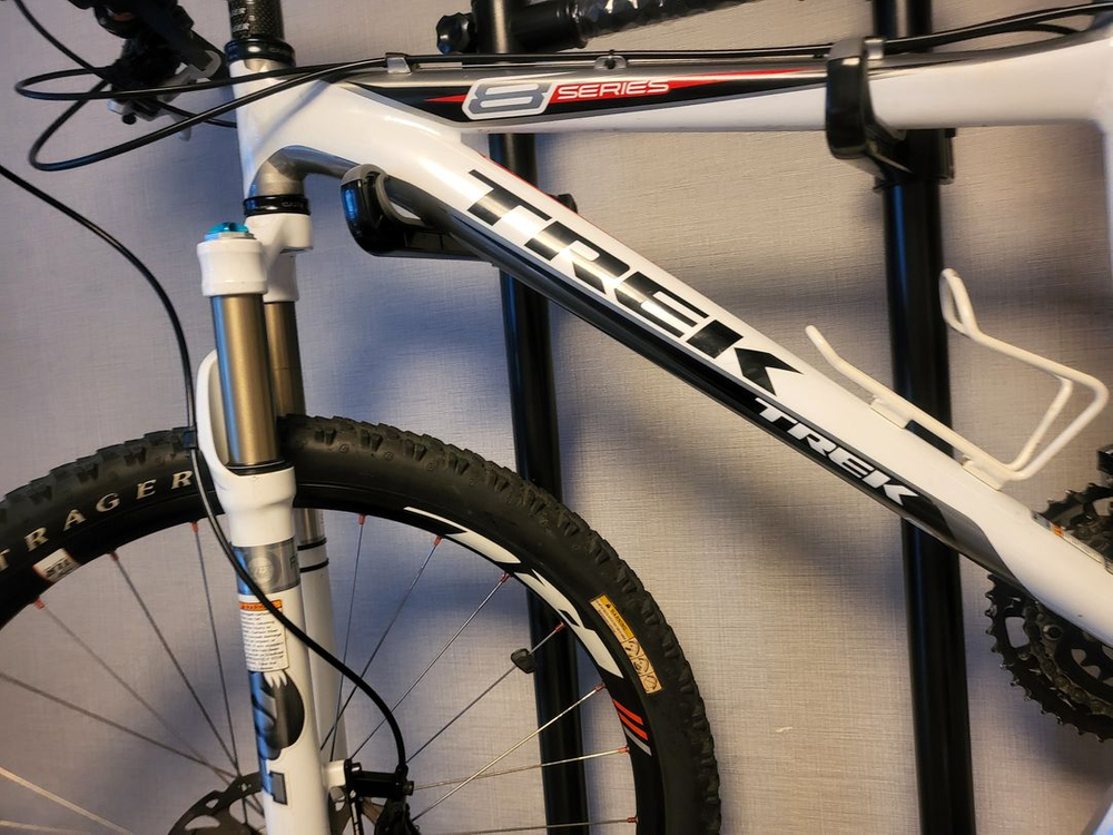 브랜드: 트렉 (Trek) 모델: 8500 MTB 자전거입니다. 화이트 프레임에 블랙 포인트가 들어간 깔끔한 디자인이에요. 전체적으로 상태 양호하며 실내 보관으로 관리 잘 된 제품입니다. 특징: 알루미늄 프레임 중 최상급인 알파 플래티늄 알루미늄을 사용한 고성능 하드테일 자전거입니다. 휠 크기: 26인치 휠을 채용했습니다. 용도: 산악 주행 및 레이싱에 적합한 모델입니다.
