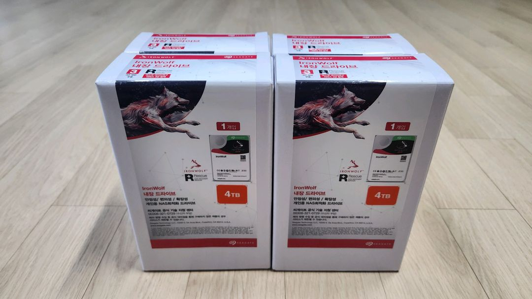 Seagate IronWolf 4TB NAS HDD 4개 패키지입니다. st4000vn006 5400 / 256m 25년 6월말 생산품이고 25년11월에 패키지로 구매하여 집 NAS에서 사용하다 용량 업글하면서 팝니다. 사진 백업용으로 쓰는 NAS라 작업시만 켜서 쓰는거라 사용시간 적고 어짜피 AS기간도 3년이라 충분히 남아있습니다. 개별 박스풀이고 정품 스티커 붙여두었고 NTFS 포맷 해두었습니다 4베이 NAS 꾸미실분에게 딱입니다.