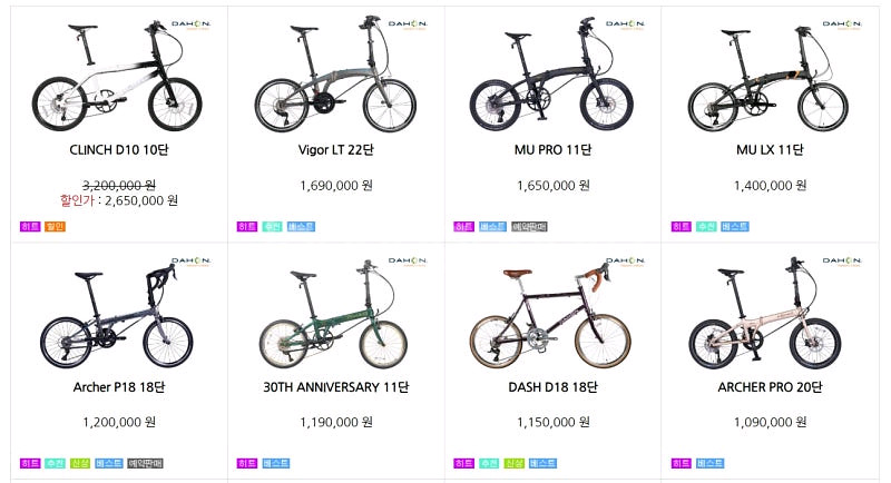 다혼미니벨로 팝니다 다혼 전제품(사진에있는거만) 취급합니다 챗주시거나 문의주시면 최저가맞춰드리겠습니다. 초특가 문의는 네이버에서 안양리버엠티비 검색 전화주세여 (챗으로 모델명 컬러 알려주시면 답장드리겠습니다) CLINCH D10 10단,Vigor LT 22단,MU PRO 11단,MU LX 11단,Archer P18 18단,30TH ANNIVERSARY 11단,DASH D18 18단,ARCHER PRO 20단,QIX D3 3단,K3 14인치 3단,LAUNCH D8 8단,D-ALPHA 7단