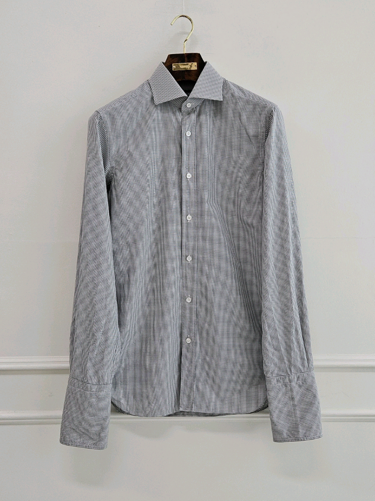 톰 포드의 미니 깅엄 체크 드레스 셔츠입니다. 멀리서 보면 그레이에 가까운 차분한 톤이지만 가까이서 보면 촘촘하게 짜인 블랙과 화이트의 미니 깅엄 체크가 드러납니다. 단색처럼 절제되어 있으면서도 단순하지 않은 톰 포드가 셔츠를 만드는 방식 그대로입니다. 카라는 톰 포드 특유의 와이드 스프레드 컷으로 넥타이를 매거나 풀어도 모두 존재감 있게 살아나며 커프스는 넉넉한 더블 커프 스타일로 마감되어 있어 수트 소매 밖으로 드러났을 때의 인상까지 계산된 디자인입니다. 사이즈 39 (15½), 컨디션 양호합니다. 어깨 46 가슴단면 50 팔기장 67 총장 78.5 클리닝 완료된 상태로 바로 착용 가능하세요 문의주세요