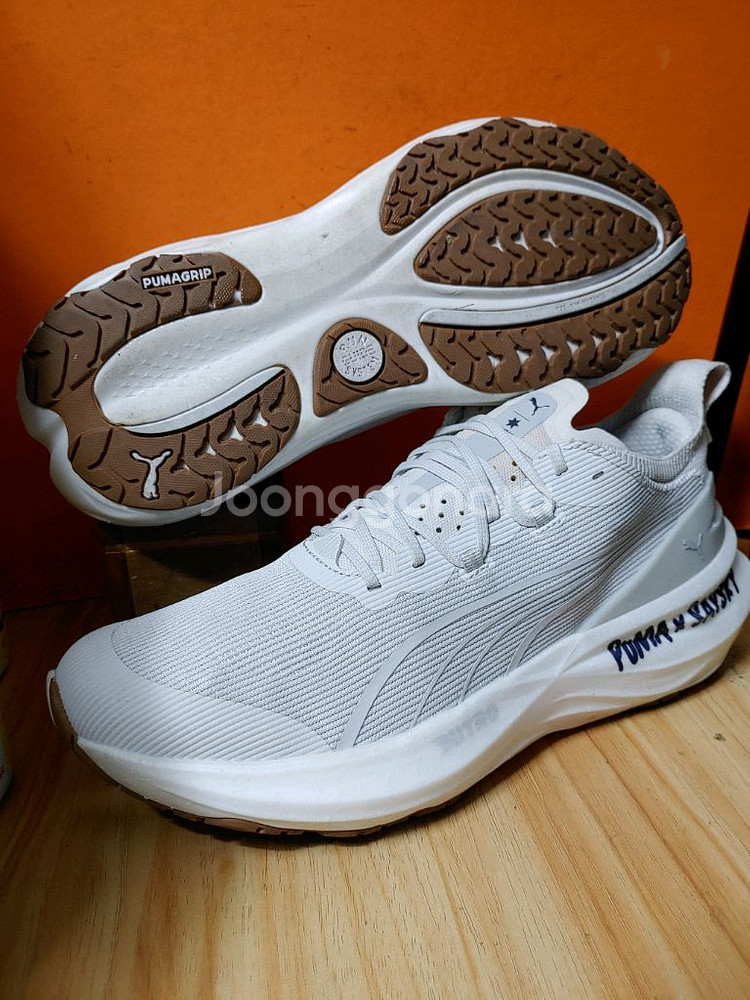 (거의새것)푸마 x SAYSKY 포에버런 나이트로2 (US10.5표기285 추천사이즈280) (한번사용) 깨끗하고 바닥상태 완벽 합니다~~!! 특유의 탁월한 쿠션감과 안정적인 접지력으로 전문가용 런닝 슈즈로 좋아요!! (하단부 영어 푸마 글씨는 고유 디자인 입니다~~!!)