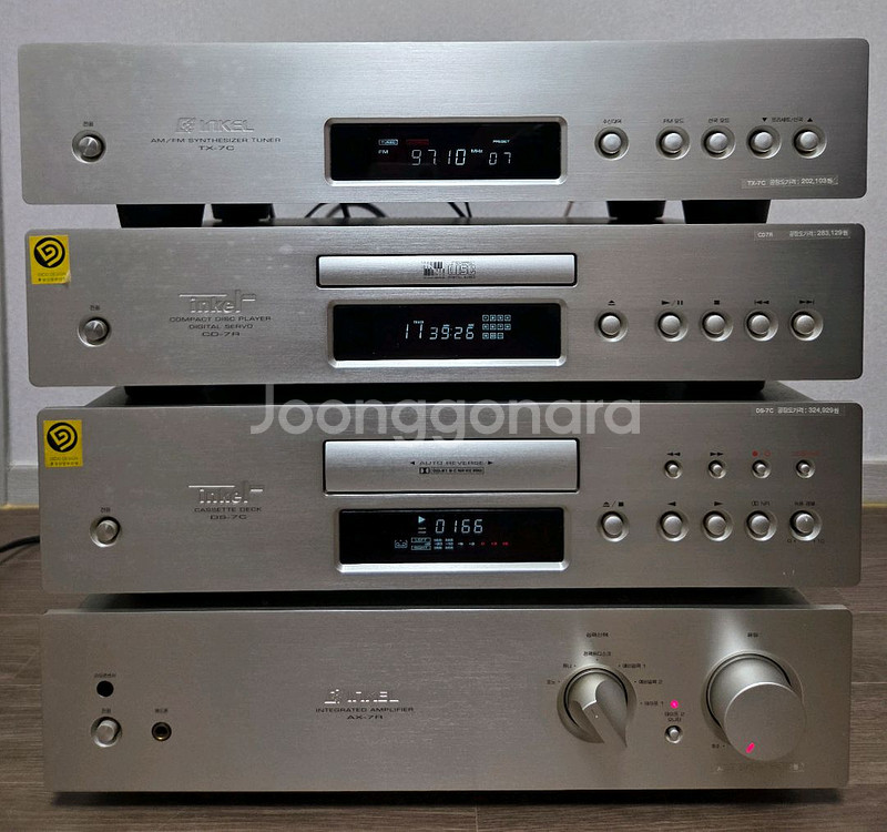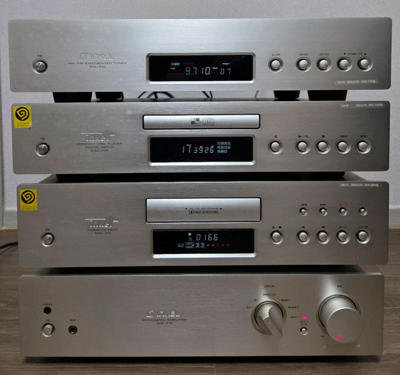 인켈 튜너 TX-7C 인켈 시디 CD-7R 인켈 데크 DS-7C 인켈 엠프 AX-7R 인켈 명기로 판매 당시 케니지가 홍보하던 제품입니다. 디자인 심플하고 통알리미늄으로 제작되어 매우 고급스러운 제품입니다. 전제품 외형 깨끗하고 상태좋습니다. 인켈 서비스센타에서 모든 기기 수리,정검받았습니다. 튜너 - 튜너 교체,스테레오 수신 잘되고 외형 깨끗하고 상태좋아요. 시디 - 벨트 교체,픽업 세척,작동 버튼 전체 교체. 후속 모델보다 고급 픽업이 장착되어있어 음질이 정말 좋습니다. 데크 - 벨트 교체,내부 청소 및 노후 부품 교체. 엠프 - 셀렉터 세척,기어 교체(반영구적)되었습니다. 전면에있는 택스위치 2개 교체.(전원,테이프2) 오리지널 모델로 좋은 음질로 호평 받았으며 후속 모델은 트랜서가 1개 장착되어있으나 이제품은 트랜서가 2개 장착되어 더 좋은 음질을 감상할수 있습니다. 박스 2곳에 나누어 안전하게 포장해서 보내드립니다.