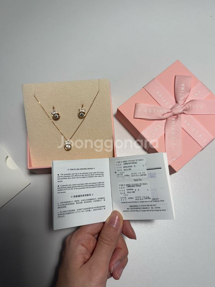 선물하기 좋은 제이에스티나 14K 미오엘로 목걸이 귀걸이 세트예요 귀를 안뚫었는데 선물 받았어서 귀걸이는 새거고 목걸이는 세네번 착용하고 보관만 해왔습니다 면세점에서 구매한 보증서 다 있습니다 목걸이 정보는 못찾겠고 귀걸이만 찾았는데 귀걸이만해도 52만원 이네요 중고제품 특성상 환불 불가합니다