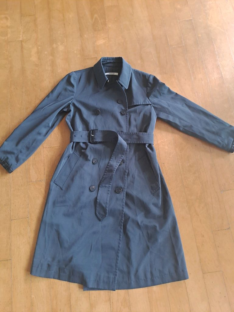 Bally 여성 트렌치 코트입니다. - 색상: 다크 그레이 - 사이즈: 가슴둘레 84cm, 신장 165cm - 재질: 폴리에스터 51% - 정가는 1,950,000원이에요 소매와 칼라에 가죽 트리밍이 있습니다.가슴반품ㅡ48(55사이즈) 기장ㅡ100 입니다.*봄,가을용입니다.목깃뒷쪽,소매끝 가죽스티치가 예쁨니다.