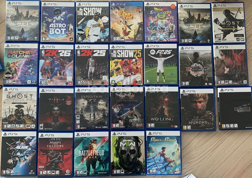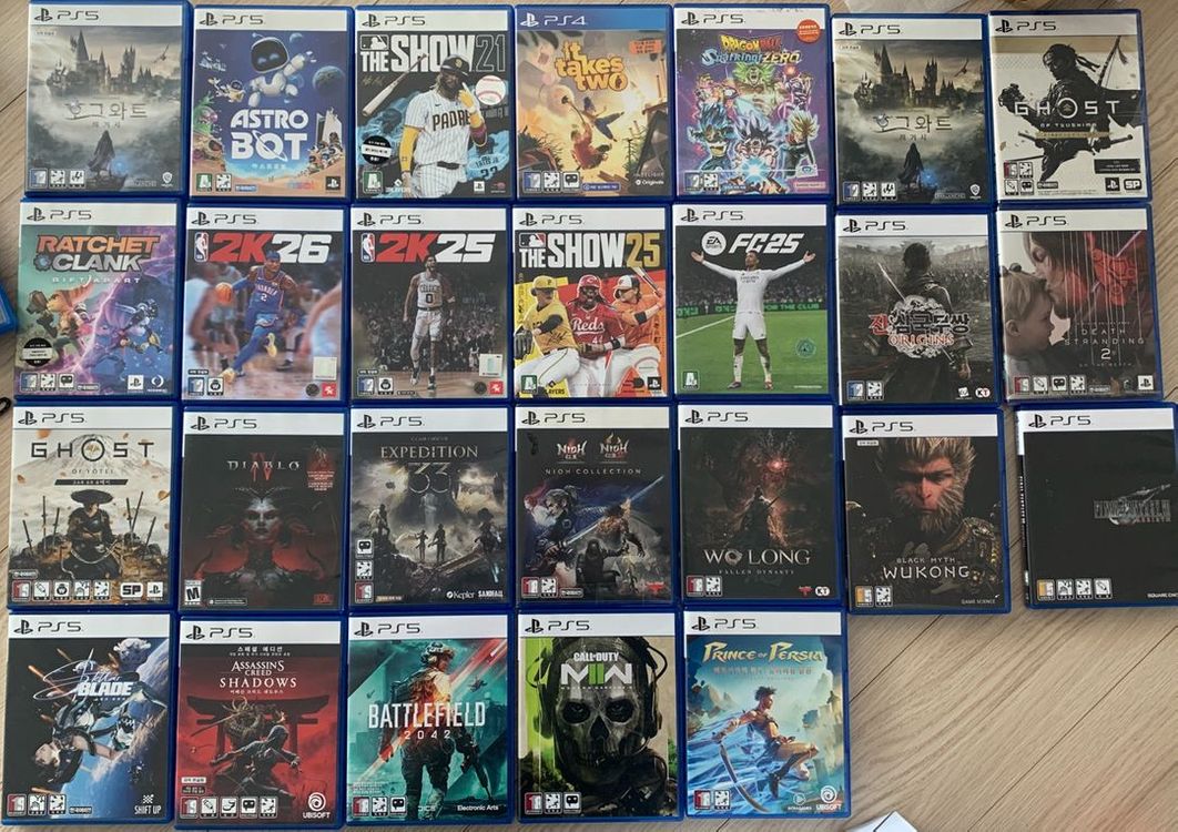 안녕하세요~! 소니 PS5 플스5 게임 팝니다. PS4 플스4 게임 팝니다. #절충 문의 사절 <PS4> 잇테이크투 (PS4) : 판매완로 그란투리스모7 (PS4) [비닐 미개봉] : 40,000원 <PS5> 오공 : 60,000원 33원정대 : 판매완로 인왕 1,2 컬랙션/인왕 컬랙션 : 27,000원 고스트오브쓰시마 : 30,000원 고스트오브요테이 : 55,000원 디아블로 : 33,000원 와룡 : 27,000원 파이널판타지7 리버스 : 판매완료 어쌔신 크리드 섀도우즈 : 40,000원 스텔라 블레이드 : 판매완로 페르시아의 왕자: 잃어버린 왕관 : 22,000원 배틀필드 2042 : 18,000원 콜오브듀티: 모던워페어2 : 50,000원 콜오브듀티 뱅가드 ; 50,000원 FC25 : 30,000 FC26 : 70,000 (미개봉 새제품) NBA 2K25 : 27,000 NBA 2K26 : 판매완로 MLB 더쇼21 : 17,000 MLB 더쇼25 : 45,000 라쳇 앤 클랭크 리프트 어파트 : 25,000 진삼국무쌍 오리진 : 40,000 호그와트 레거시 : 33,000 드래곤볼 스파킹 제로 : 45,000원 아스트로 봇 : 판매완료 그외 다양한 타이틀 보유중. #절충 문의 안받아요. 그외 GS25반택, 일반택배 가능.