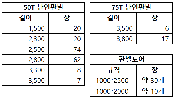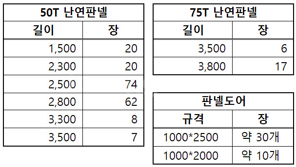 개인정보(거래정보)를 주고받는 행위는 사기에 노출될 수 있으므로 즉시 중고나라로 신고해 주세요50T와 75T 규격의 난연판넬이에요. 건물 구조나 방음 효과가 필요한 곳에서 사용하기 좋은 제품입니다. 일괄 판매 우선 입니다.