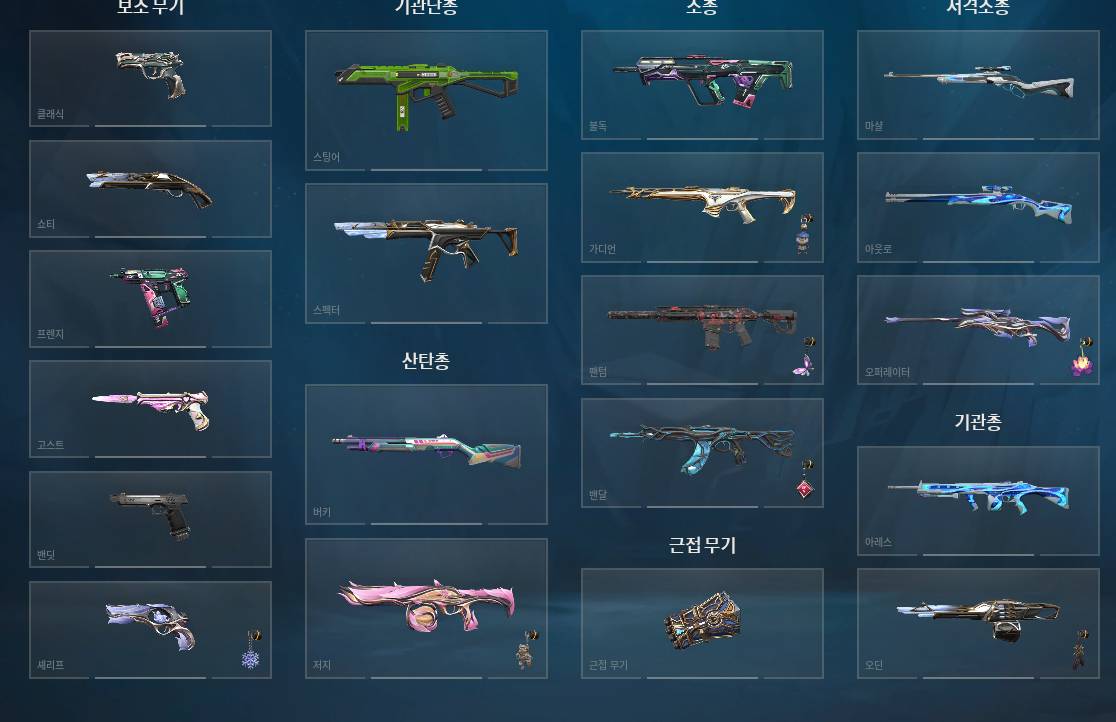 아섭 엑트9 불멸 현 다2 입니다 클래식 : 포세이큰 쇼티 : 빛감 고스트 : 에보리 셰리프 : 미스트블룸 쿠로나미 스펙터 : 빛감 저지 : 미스트블룸 가디언 : 소버린 팬텀 : 정찰 24챔 미스트블룸 빛감 혼서 밴달 : 가이아 아락시스 아케인 에이몬디어 싱귤 포세이큰 프리모디움 혼서 25챔 글팝 칼 : 약탈자 24챔 25챔 아케인 미스트블룸 빛감 오딘 : 빛감 오퍼 : 미스트블룸 전략 부대 플레이어 카드도 있습니다