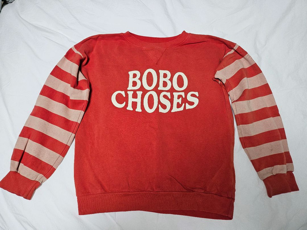 보보쇼즈 레드 스트라이프 맨투맨이에요 사이즈155 리틀그라운드에서 구입했었어요 어디에나 다 잘어울려요 팔부분이랑 티셔츠 하단부분 조금 오염있습니다 반품X