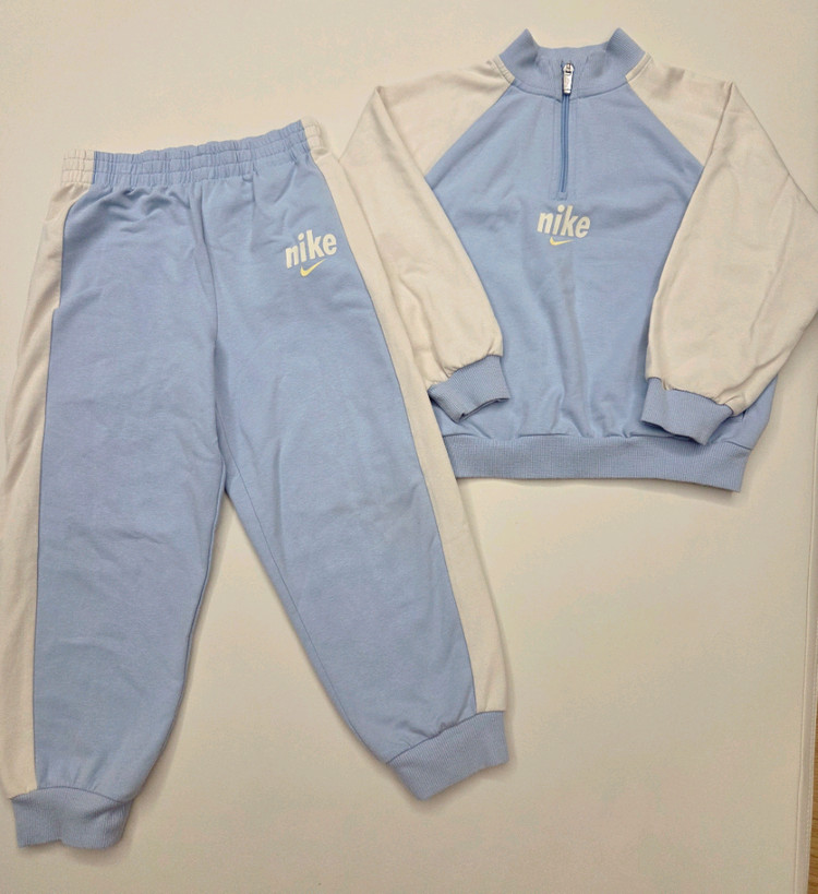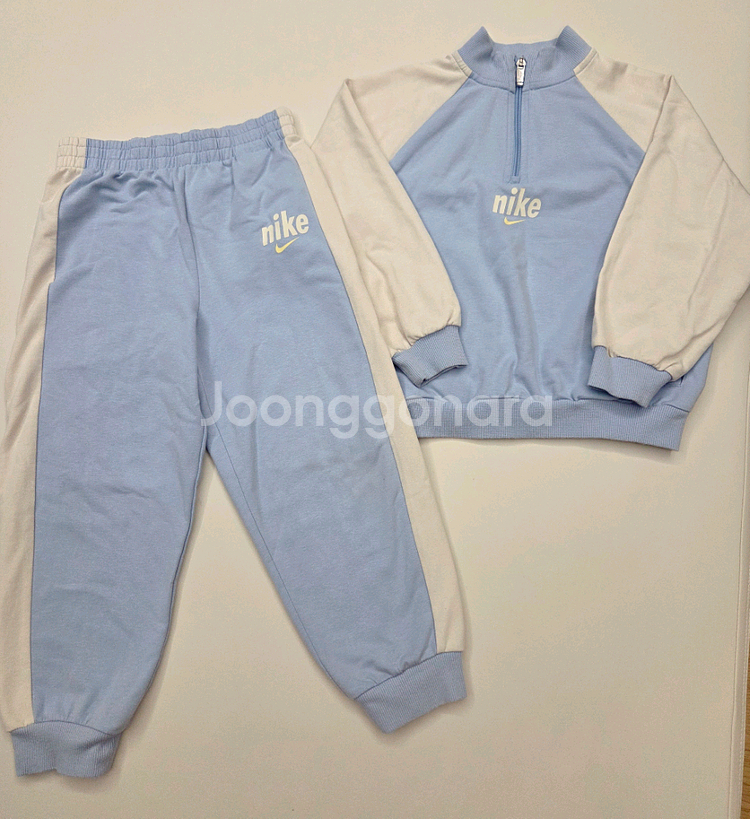 나이키키즈 상하세트 120입니다. 시보리 있어 110부터 착용 가능하며, 얇은 면 소재로 부드럽고 봄·가을용이에요. 큰 이염 없이 깨끗해 보입니다. 다만 허리 조절 부분이 없어 직접 구멍을 내어 고무줄을 넣었습니다. 참고 부탁드리며, 예민하지 않으신 분께 추천드려요.