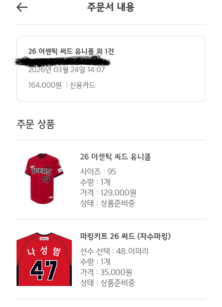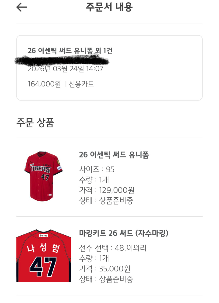개인정보(거래정보)를 주고받는 행위는 사기에 노출될 수 있으므로 즉시 중고나라로 신고해 주세요기아타이거즈 써드 유니폼 95 사이즈 자수마킹 이의리 예약배송으로 구매 시, 주소 변경해서 출고