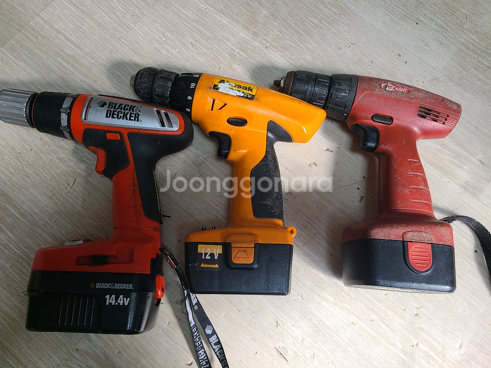 전동 드릴 3종 세트입니다. - Black & Decker (블랙앤데커) 14.4V - Aimsak (아임삭) 12V - Keyang (계양) 14.4V 전체적으로 사용감 있습니다. 세트당 가격이며, 배터리 포함하나, 충전기들은 없습니다. 현재 배터리 잔량남아서 테스트 가능합니다. 0ㅣ0 오구공육 4하나 9하나 로 문의바랍니다.