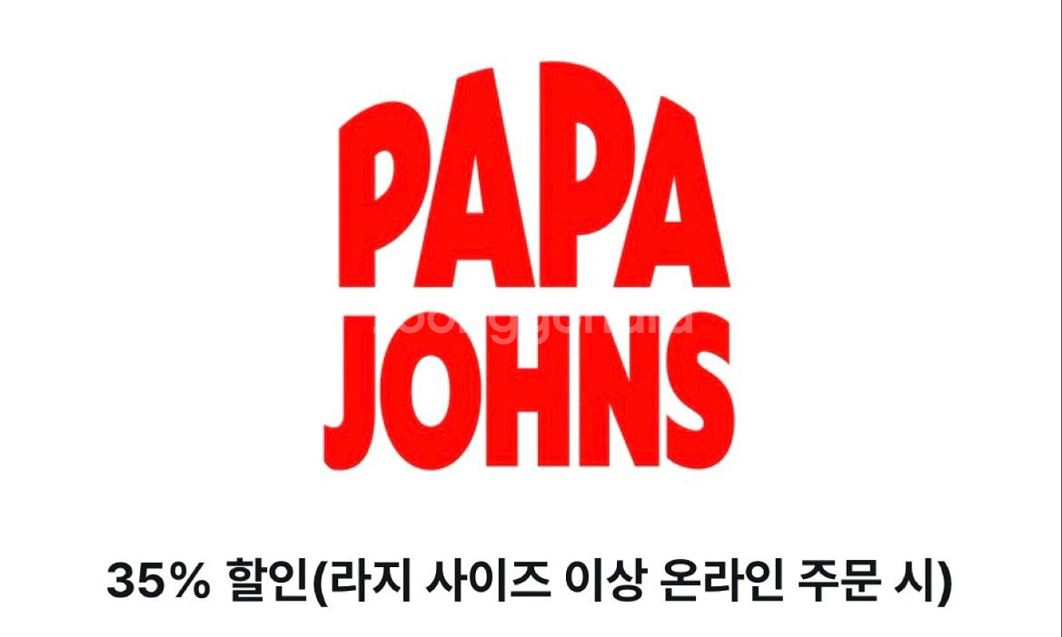 입금 확인 후 채팅창으로 쿠폰번호 보내드립니다. 채팅 주세요~ - 이용 기간 : 2026년 4월 1일 ~ 4월 30일 - 혜택 내용 : 라지 사이즈 이상 온라인 주문 시 35% 할인 - 이용 불가 매장 : 롯데마트 중계점, 곤지암 리조트점, 한솔 오크밸리점, 평창 대관령점, KT 위즈파크점, SSG 랜더스점, 삼성 라이온즈 파크점, 롯데 사직구장점, 기아 챔피언스필드점, 고려대점 Step 1. 로그인 > 쿠폰번호 등록 Step 2. 피자 선택 후 주문하기 Step 3. 주문 시 쿠폰 적용 > 할인금액 확인 후 결제 - 본 쿠폰은 파파존스 홈페이지/앱에서 라지 사이즈 이상 피자 주문 시 1판에만 할인 적용이 가능합니다. - 본 쿠폰은 하프 앤 하프, 사이드메뉴 및 이벤트/특가 상품 등 일부 상품에 대해서는 쿠폰 사용이 제외됩니다. - 본 쿠폰은 신한카드(개인신용 및 체크 가능 / 신한BC,선불,기프트,법인카드 제외) 결제 시에만 이용 가능합니다. - 본 쿠폰은 기타 할인 쿠폰 및 혜택과 중복 적용 불가합니다. 판매자 귀책이 아닌 경우 환불 불가