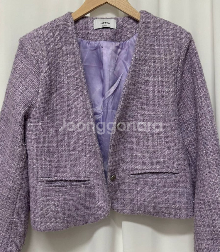 개인정보(거래정보)를 주고받는 행위는 사기에 노출될 수 있으므로 즉시 중고나라로 신고해 주세요파파야 브이넥 노카라 트위드 자켓입니다. 보라색감 베이스에 실버버튼 디자인이고 은사펄이 은은하게 반짝이는게 포인트에요^^ ✅표기사이즈는Free 실측가단50 총장52 정도 확인됩니다🥰
