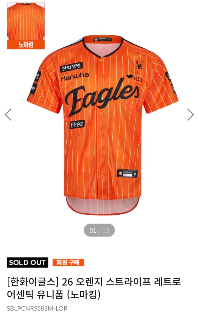 개인정보(거래정보)를 주고받는 행위는 사기에 노출될 수 있으므로 즉시 중고나라로 신고해 주세요한화 이글스 오렌지 스트라이프 레트로 어센틱 유니폼입니다. 새제품 수령 즉시 발송드립니다. 사이즈는 90 노마킹 상품입니다.