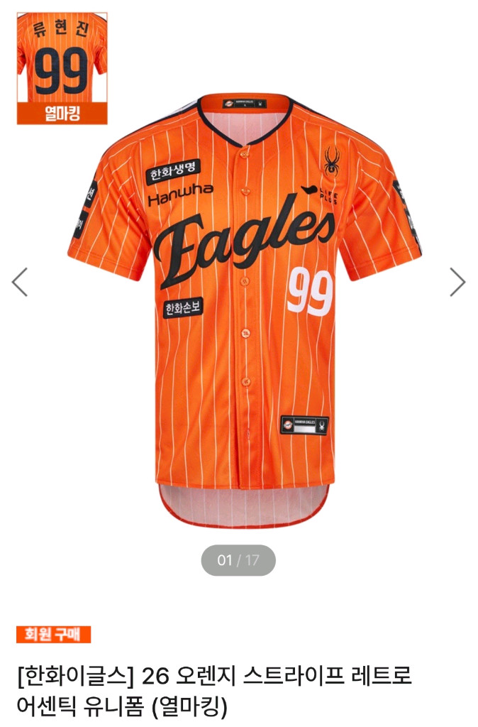 개인정보(거래정보)를 주고받는 행위는 사기에 노출될 수 있으므로 즉시 중고나라로 신고해 주세요한화 이글스 빙니폼 26 오렌지 스트라이프 레트로 어센틱 유니폼 (열마킹)입니다. 수령 즉시 발송 드립니다. 사이즈 90 마킹 문현빈