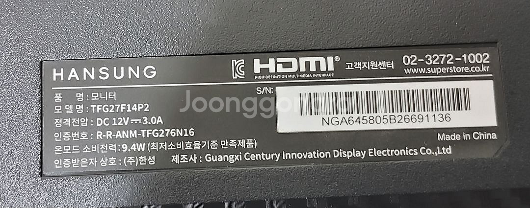 ![[모니터]한성컴퓨터 TFG27F14P2 FHD IPS 144Hz 27인치 이미지](https://img2.joongna.com/media/original/2026/04/03/1775203190451cGE_zzl8e.jpg?impolicy=resize)