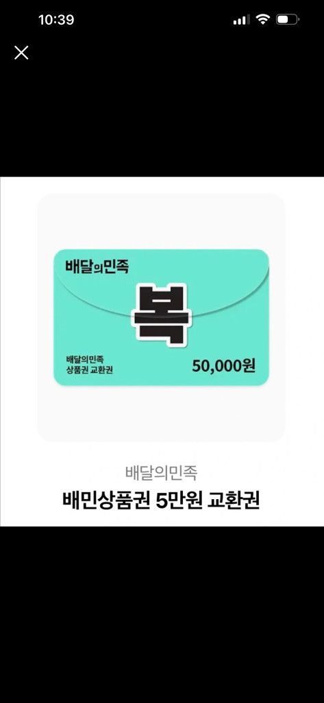 개인정보(거래정보)를 주고받는 행위는 사기에 노출될 수 있으므로 즉시 중고나라로 신고해 주세요배달앱에서 사용 가능한 5만원 상품권이에요. 배달이나 음식 주문할 때 현금처럼 사용하실 수 있습니다. 유효기간 1년