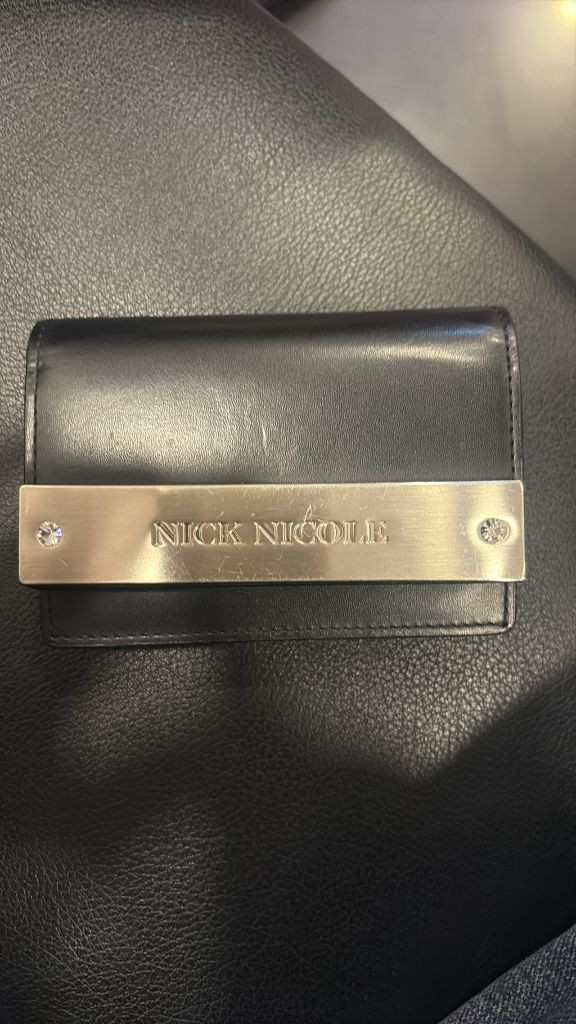 블랙 가죽 명함지갑이에요. 골드 메탈 플레이트가 포인트로 들어가 있어서 고급스러워 보여요. 사용감은 있지만 전체적으로 깔끔한 상태입니다.