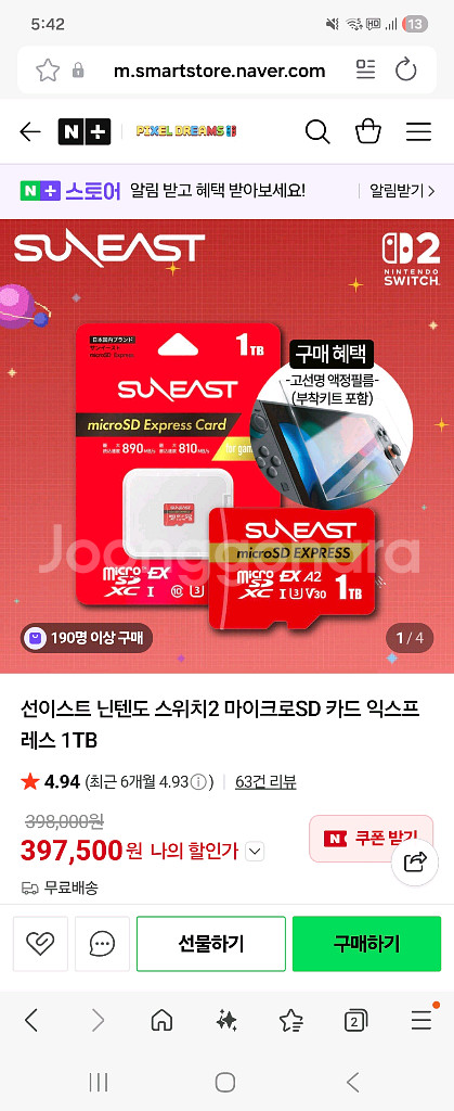 닌텐도 스위치2 마이크로 SD카드 익스프레스 외장 메모리카드 1TB 선이스트 1번사용