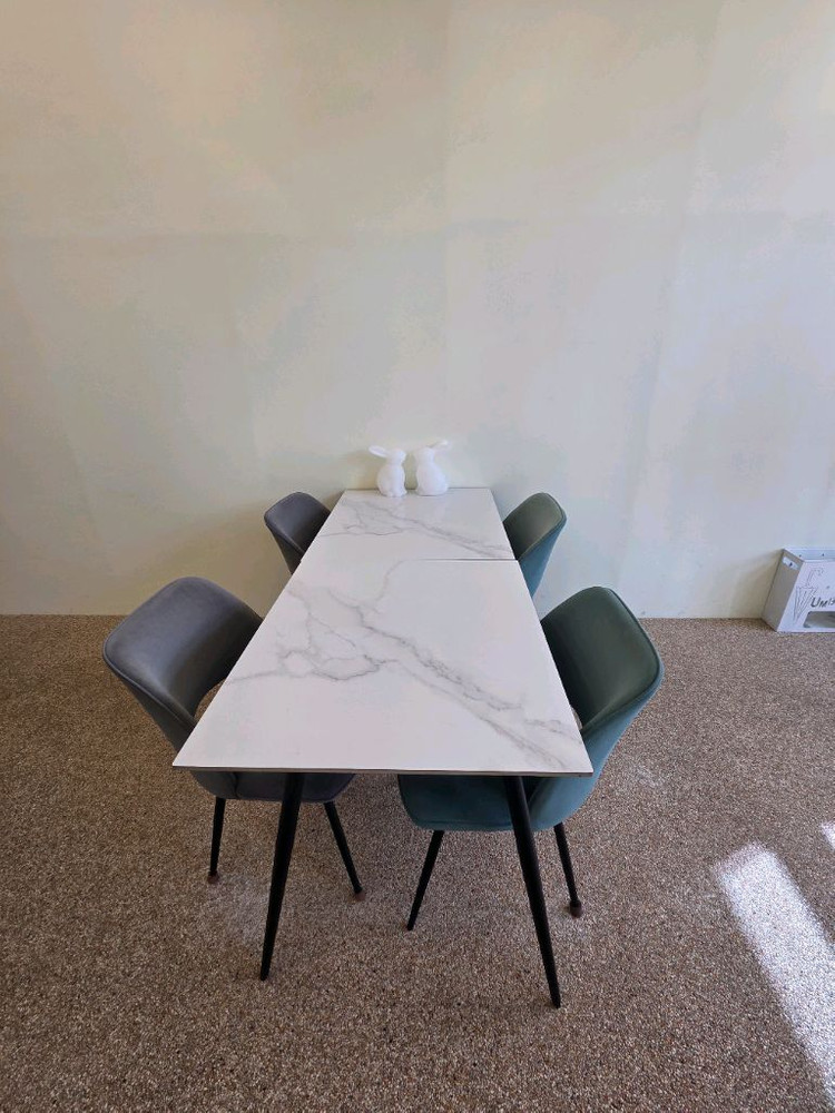 개인정보(거래정보)를 주고받는 행위는 사기에 노출될 수 있으므로 즉시 중고나라로 신고해 주세요깔끔한 화이트 마블 패턴의 세라믹 식탁과 그레이 체어 4개로 구성된 세트예요. 모던한 디자인으로 어떤 인테리어에도 잘 어울리고, 상태도 양호합니다.