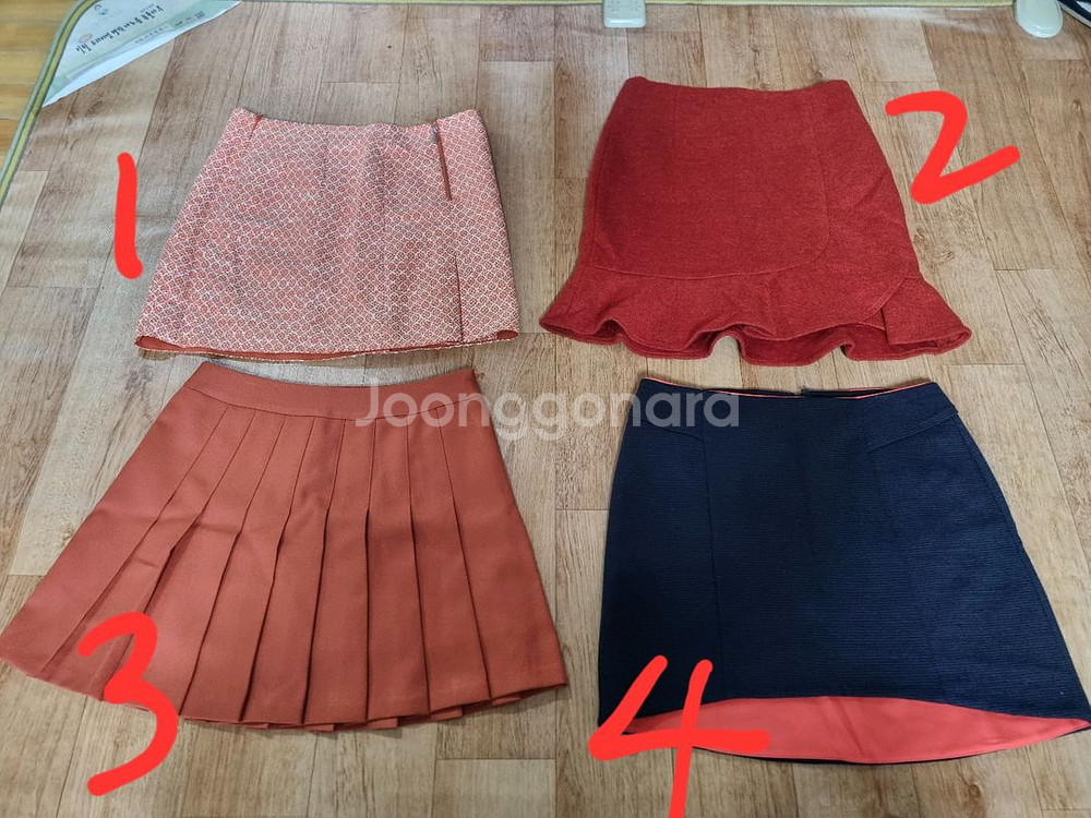 미니 스커트 4종 판매해요 다양하게 꾸밀수있는 치마이고 거의 새것같아요 사이즈는 사진순서대로 참고하신고 서로 비슷한 66사이즈입니다. 3번 옷이 예쁜데 약간의 쩜쩜 이염이 있어요, 감안하셔서 구입하세요 다량구입 시 할인해드려요, 1번 : 허리단면 38cm , 길이 40cm 2번 : 허리단면 36cm , 길이 50cm 3번 : 허리단면 36cm , 길이 40cm 4번 : 허리단면 39cm , 길이 44cm 🚫 환불 노우!! 🚫 반품 노우!! 🆗 쿨거래 오케이!! 🆗 반값택배 오케이!! (택배비는 구매자님 부담)
