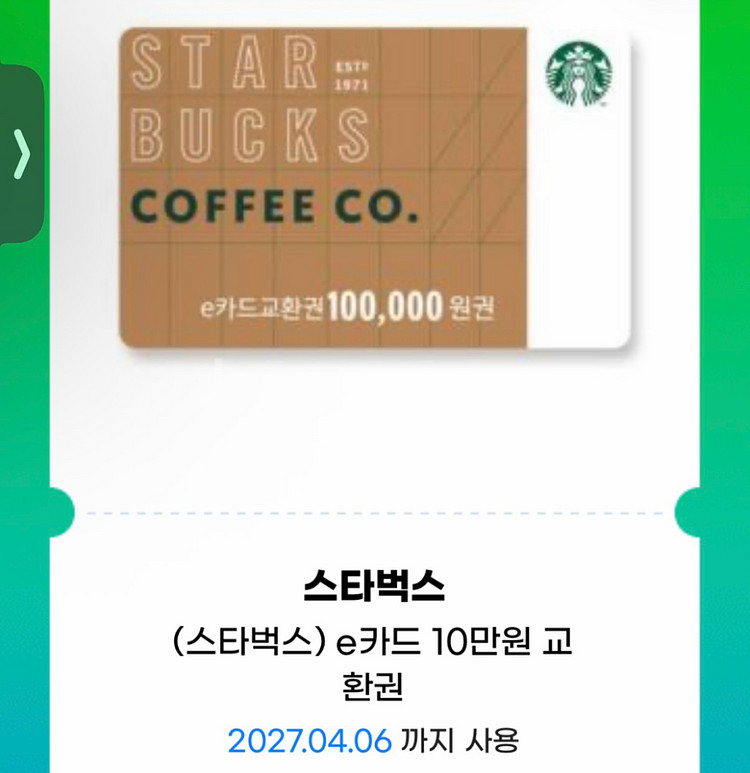 개인정보(거래정보)를 주고받는 행위는 사기에 노출될 수 있으므로 즉시 중고나라로 신고해 주세요스타벅스에사 사용 가능한 10만원 상당의 e카드예요. 2027년 4월까지 사용 가능하니 충분히 활용하실 수 있어요! 장당 88,000에 판매합니다.