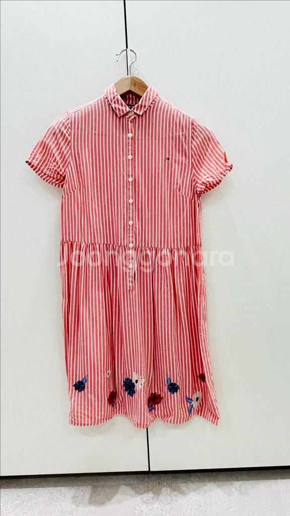 타미힐피거 원피스 판매합니다. 핑크색과 흰색 스트라이프 패턴에 밑단에 꽃 자수가 놓여 있어요. - 브랜드: 타미힐피거 (Tommy Hilfiger) - 사이즈: US 16 - 색상: 핑크화이트 -셔츠 원피스고 후들후들 거리는 재질이라 이뻐요 - 두번 정도 입혀서 상태 아주 좋아요 - 사용 나이 9세 이상