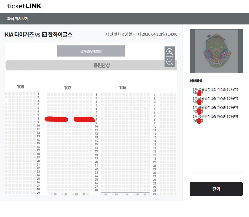 개인정보(거래정보)를 주고받는 행위는 사기에 노출될 수 있으므로 즉시 중고나라로 신고해 주세요KIA 타이거즈 vs 한화이글스 경기 티켓 양도해드립니다. 4/12 일 오후2시 1루 카스존 107구역 8열 연석 4장 -장당8만원 양도해드립니다.채팅 부탁드립니다 *스마트티켓 선물하기로 양도해드립니다* (선입금X, 티켓 등록 하신 후에 일괄 금액 송금 받습니다)