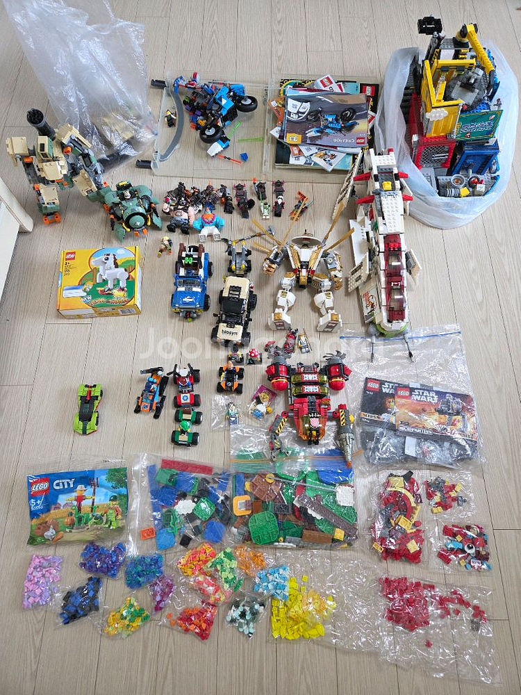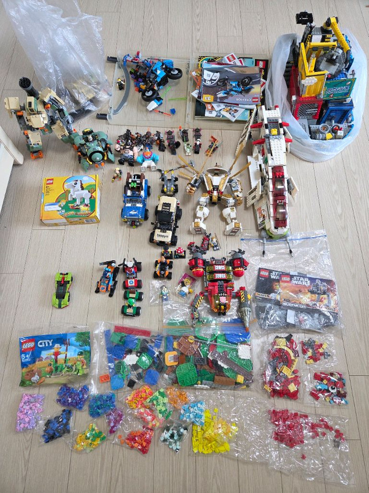 분할 불가(포장완료)! 레고 자동차(쥬라기월드/시티 위주), 로봇(닌자고/오버워치 등), 우주선(스타워즈, 아틀란티스 등) 미피 여러가지 등등 포함해 판매합니다. 부품 검수 전혀 안했습니다. 사진 구성 그대로입니다. 일부 제품 박스나 제품 폴리백에 들은건 미사용품입니다. 전부 정품입니다. 지속적인 레고 생활을 위해 관심 떨어진거 일괄로 던집니다.