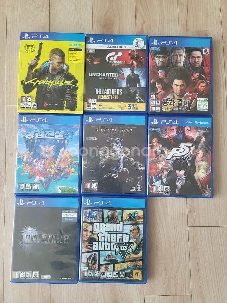 플스4 ps4용 게임타이틀 9장 팝니다 사진의 게임3개 합본에 라스트 오브 어스는 없습니다. 사이버펑크 2077 용과같이7 미들어스 섀도우 오브 워 페르소나5 GTA5 파이널판타지15 성검전설3 언차티드4, 그란투리스모 스포트 (합본) 각각은 1만원 일괄 8만원에 판매합니다 창원 대원동 직거래 타지역 택배거래 가는합니다
