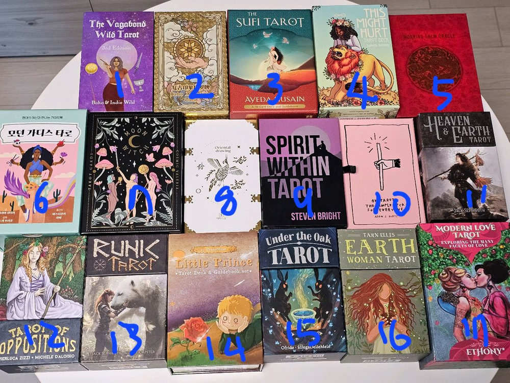여러개 구매 또는 일괄 구매 시 - 할인📌 급전이 필요하여 싸게 내놓았습니다📌 소장용으로 소장했던 제품들이고 환불은 안됩니다📌 [구매희밍자]만 문의주시면 카드 직접 찍어 보내드립니다📌 제품 원가와 비교해서 보기좋게 올렸으니 할인 판매합니다📌 1. 배가본드 와일드 타로 카드 3rd [미사용] 달샤인상점 원가 : 63,000원 -> 판매가 : 55,000원 2. 레트로 임프레션 타로 카드 [미사용] 인터타로 원가 : 84,000원 -> 판매가 : 70,000원 3. 수피 타로 카드 [미사용] 인터타로 원가 : 36,000원 -> 판매가 : 25,000원 4. 모던 타로 라이브러리 타로카드 [미사용] 원가 : 39,000원 -> 판매가 : 25,000원 5. 모닝캄 오라클 카드 [미사용] 인터타로 원가 : 65,000원 -> 판매가 : 40,000원 6. 모던 가디스 타로 카드 [미사용] 인터타로 원가 : 42,000원 -> 판매가 : 35,000원 7. 문 위치 타로 카드 [미사용] 인터타로 원가 : 75,000원 -> 판매가 : 65,000원 8. 금박 오리엔탈 드로잉 타로 카드 [미사용] - 판매완료 다미드림 원가 : 100,000원 -> 판매가 : 85,000원 9. 스피릿 위딘 타로 카드 [미사용] 인터타로 원가 : 38,000원 -> 판매가 : 27,000원 10. 오케이 타로 카드 [미사용] - 판매완료 아잉의 마법상점 원가 : 40,000원 -> 판매가 : 30,000원 11. 헤븐 앤 어스 타로 카드 [사용감 o] 인터타로 원가 : 30,500원 -> 판매가 : 15,000원 12. 어퍼지션 타로 카드 [미사용] 인터타로 원가 : 37,000원 -> 판매가 : 25,000원 13. 루닉 타로 카드 [미사용] 인터타로 원가 : 36,000원 -> 판매가 : 25,000원 14. 어린왕자 타로 카드 [미사용] 프라임뮤즈 원가 : 44,000원 -> 판매가 : 37,000원 15. 언더 더 오크 타로 카드 [미사용] 인터타로 원가 : 38,000원 -> 판매가 : 30,000원 16. 어스 우먼 타로 카드 [미사용] 인터타로 원가 : 37,000원 -> 판매가 : 30,000원 17. 모던 러브 타로 카드 [미사용] 인터타로 원가 : 60,000원 -> 판매가 : 45,000원 18. 이너 라이트 타로 카드 [미사용] 인터타로 원가 : 28,000원 -> 판매가 : 20,000원 19. 기묘한 세계 타로 카드 [미사용] 해외직구 원가 : 66,000원 -> 판매가 : 35,000원 20. 유령의 집 타로카드 [미사용] - 판매완료 인터타로 원가 : 25,000원 -> 판매가 : 17,000원 21. 로맨틱 타로 카드 [미사용] 인터타로 원가 : 23,000원 -> 판매가 : 17,000원 22. 바이스 버사 : 시선의 양면 타로 카드 [미사용] 인터타로 원가 : 26,000원 -> 판매가 : 20,000원 23. 텔레마 타로 카드 [사용감 o] 인터타로 원가 : 34,000원 -> 20,000원 24. 노마드 소울워리어 타로카드 [미사용] 해외직구 원가 : 98.000원 -> 판매가 : 45,000원 26. 바이올렛 소울 타로 카드 [미사용] 해외직구 원가 : 19만원 -> 판매가 : 10만원 <구매내역o> 27. 라인스케이프 타로 카드 [미사용] 달샤인상점 원가 : 55,000원 -> 판매가 : 40,000원 28. 르네상스 타로 카드 [미사용] 인터타로 원가 : 28,000원 -> 판매가 : 20,000원 29. 아르카눔 타로 카드 [사용감 많음] 인터타로 원가 : 34,000원 -> 판매가 : 17,000원 - 30번부터 카드만 있어서 주머니 증정 - 30. 기억이 나지 않습니다 [미사용] 판매가 25,000원 31. 화이트 캣츠 타로 카드 [사용감 o] 인터타로 원가 : 26,000원 -> 판매가 : 10,000원 32. 골든 유니버셜 웨이트 [사용감 많음] 인터타로 원가 : 32,000원 -> 판매가 : 10,000원 33. 아리 타로 카드 [미사용] 인터타로 원가 : 77,000원 -> 판매가 : 40,000원 34. 일루미나티 타로 카드 [미사용] 인터타로 원가 : 39,000원 -> 25,000원 35. 아쿠아리안 타로 카드 [사용감 o] 인터타로 원가 : 27,000원 -> 판매가 10,000원