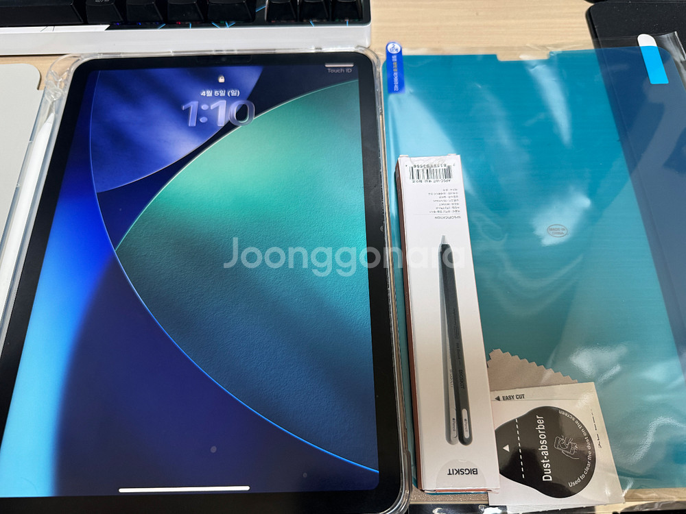아이패드 에어4 스카이 블루 색상입니다 항상 케이스 필름 붙여두고 사용해서 큰 하자는 없는 거 같은 데 예민하신 분들은 피해주세요 화면은 필름 떼고 쓴 적 없어서 깔끔할 거 같습니다 케이스도 최근에 사서 다시 끼웠습니다 애플펜슬2 케이스랑 종이 필름 여분 하나도 드립니다