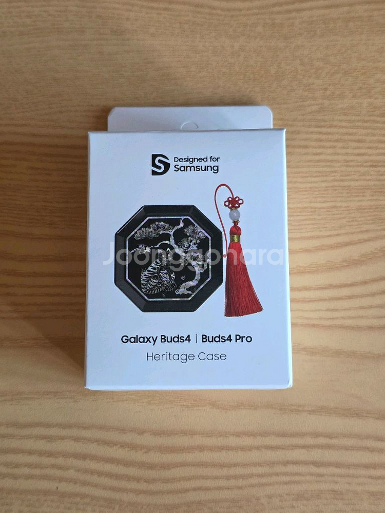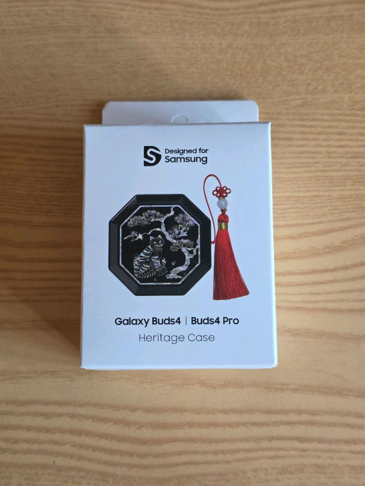 갤럭시 버즈4 프로 전용 케이스예요. 삼성 스토어에서 구매한 제품입니다. 호랑이 문양이 새겨져 있어 고급스러워요. 선물하기 좋은 아이템이랍니다.