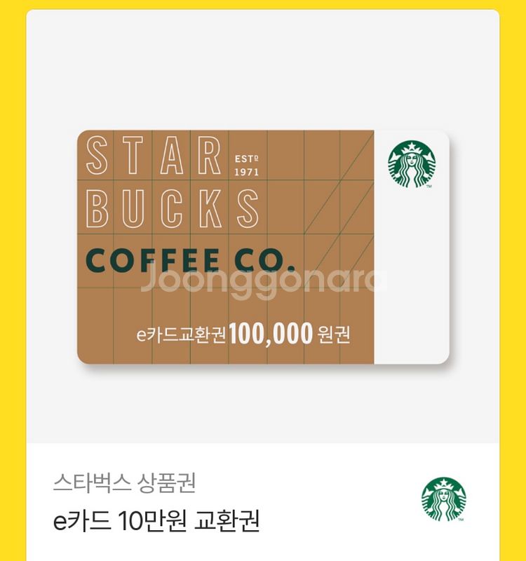 개인정보(거래정보)를 주고받는 행위는 사기에 노출될 수 있으므로 즉시 중고나라로 신고해 주세요스타벅스 10만원권 / 1장 판매 -> 87,000 등록 유효기간 27.4 선입금(중고나라 등록계좌), 이미지 전송 드립니다.