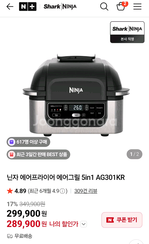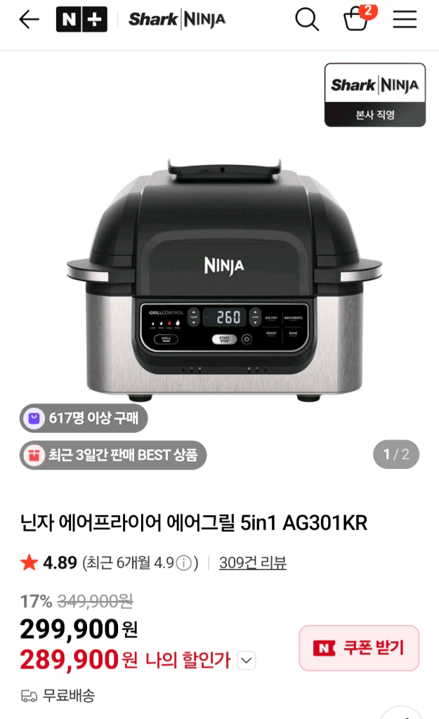 닌자 에어프라이어 에어그릴 5in1 AG301KR 판매해요 단순개봉 미사용 새상품입니다 이미 에프가있어 놓을곳이 없네요ㅜ 5가지 요리가 가능한 멀티 에어프라이어예요 그릴, 에어프라이, 로스트, 베이크, 디하이드레이트 기능이 있어요 정가 349,900원이에요 직거래 평일 6시 이후 거래 가능하고 반품은 어려워요