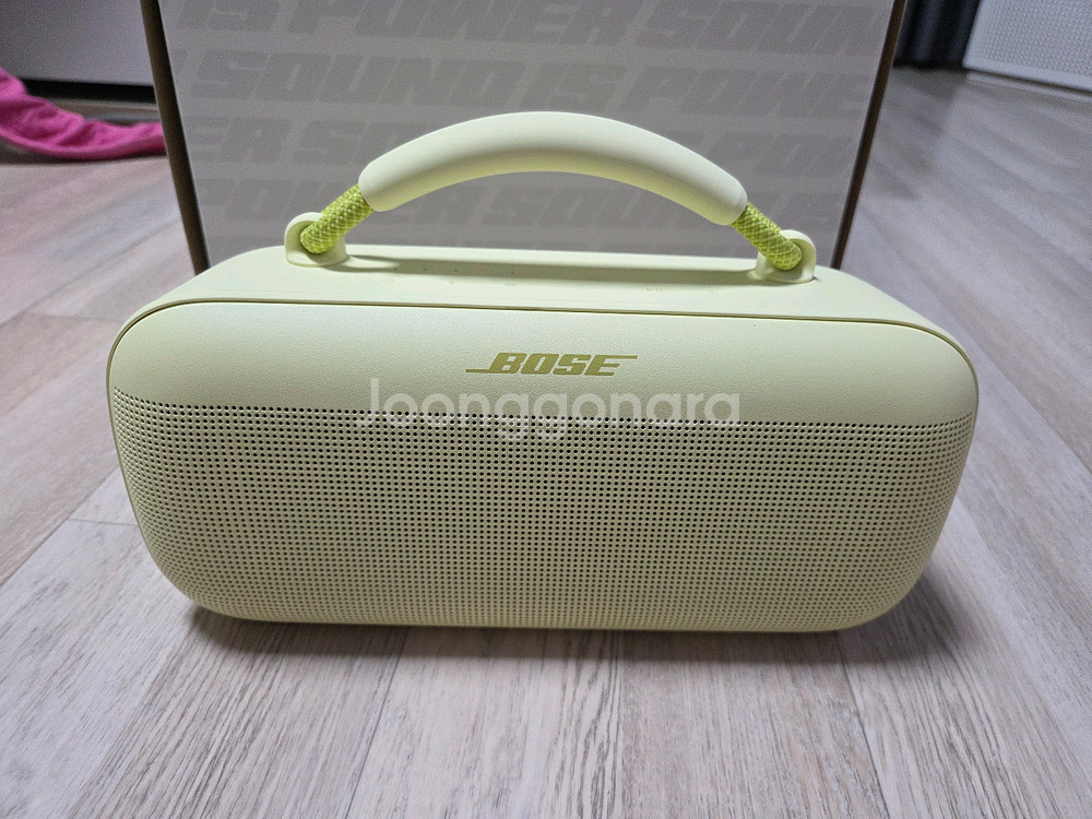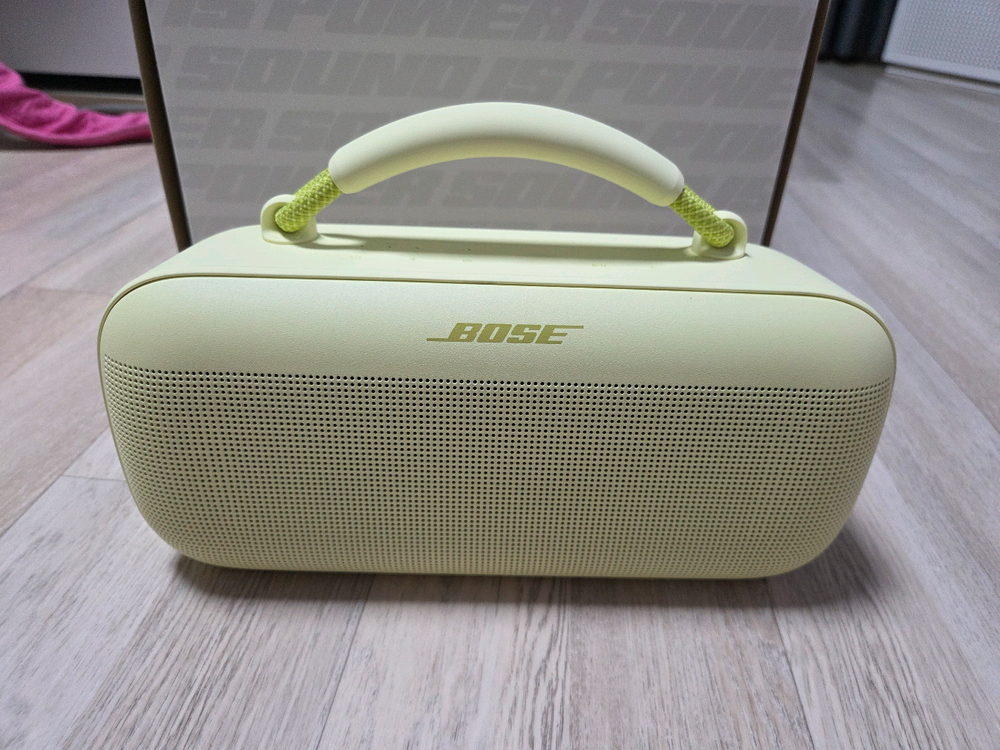 보스 사운드링크 맥스 포터블 스피커 옐로우 색상이에요 박스와 구성품 모두 포함되어 있어요 사진에서 보이는 것처럼 깔끔한 상태를 유지하고 있어요 풍부한 사운드를 어디서든 즐기고 싶으신 분들께 추천드려요 어제 선물받아 작동여부확인만한 새상품입니다 택배가능합니다 원박스 보호박스 있어서 택배가능