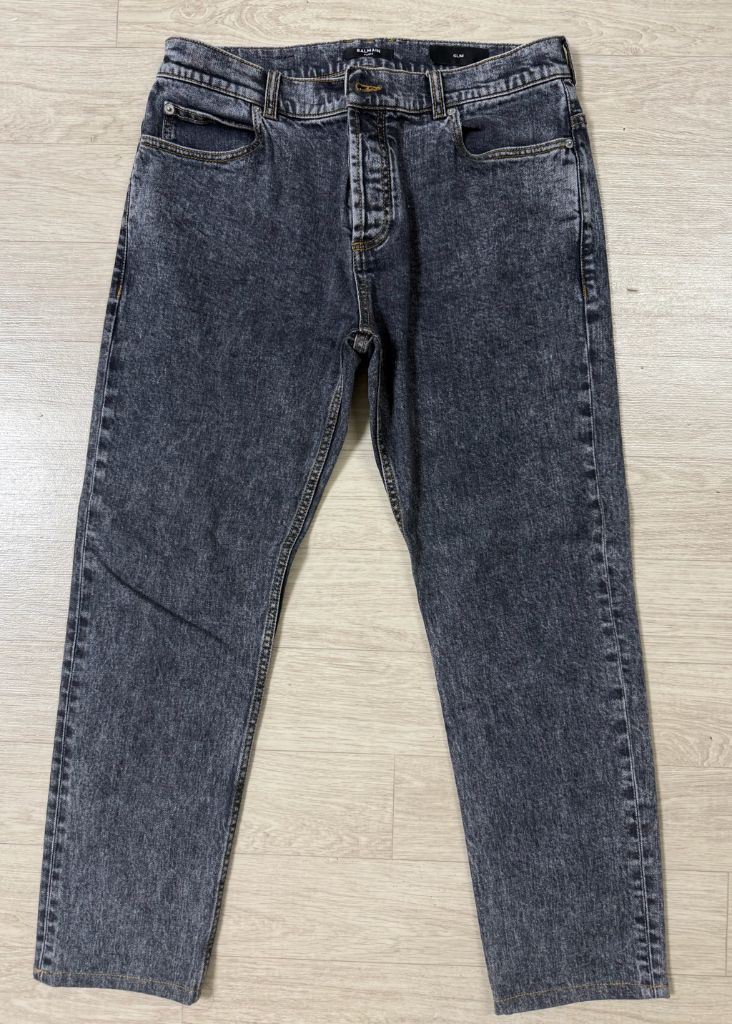발망 남성 슬림 데님 팬츠입니다. 사이즈 32이며, 모델명은 AH1MG000DD10 입니다. 네이버나 구글 검색해보시면 디테일 보실 수 있습니다. 2023년 SS 시즌 상품으로, 멕시코 Palacio de Hierro 백화점 발망매장에서 본인 직접 구매했습니다. 현지에서 구매가 100만원정도 주고 샀고, 한국에서 검색해보니 직구로 100만원 이상은 되는 것 같네요. 한철 입다가 살이 쪄서 잘 안입고 보관해서 상태 좋습니다. 면에 엘라 2% 들어가서 신축성 있는 원단입니다. 밑단은 살리지 않고 기장수선 했습니다. 실측 허리단면 40cm 기장 93.5cm 밑통 17cm