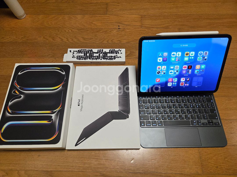구성품 1. 아이패드 프로 11인치 M4 셀룰러 512GB(스페이스그레이) 정가 : 209.9만 2. 매직키보드(프로 11인치용) 정가 : 44.9만 3. 애플펜슬 프로 정가 : 19.5만 총 274.3만원 2025년 1월 구매했구요.. 원래 애플은 이유없이 갖고싶은지라 이유없이 구매했다가 보관만 하다 내놓습니다. 배터리 성능 최대치는 100%이고 사이클 수는 54회입니다. 보시다시며 거의 안썼습니다 새거라고 보시면 됩니다 매직키보드 애플펜슬 같이 팔구요 전부 풀박에 악세사리는 건들지도 않았습니다 토탈 200만원입니다.