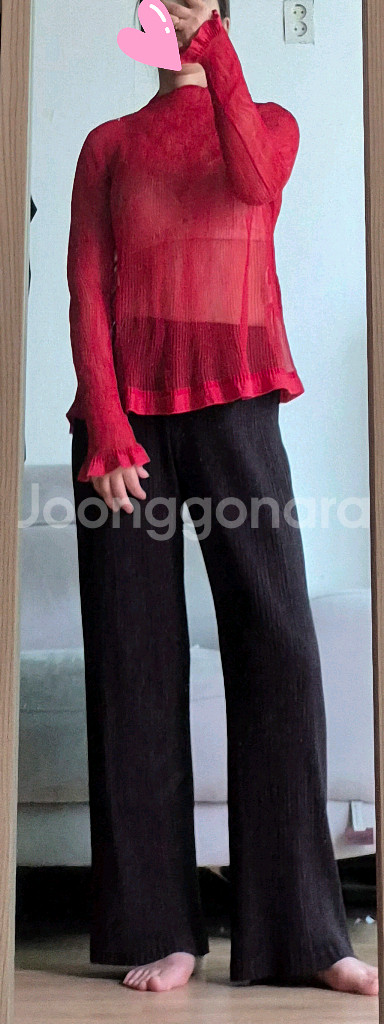 이세이미야케중 최고값나가는 화이트라벨 이세이미야케입니다. 강렬한 레드지만 러블리한 시스루 플리츠 다른 트위스트보다 프릴과 살짝 에이라인으로 더욱 여성스러움이 강조된 플리츠입니다. 사진은 그냥 찍었지만 이너는 갖춰입으셔야해요. 한번착용 새옷과 같고 저렴히 올리고 일제옷선물도 넣어드려욤