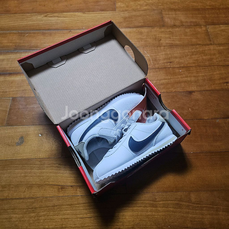 키즈용 운동화예요. 화이트 베이스에 네이비 포인트가 깔끔하고 예쁘네요. 박스 포함 상태 좋은 새상품입니다. 프리미엄 아울렛 공식 매장에서 구입했습니다.